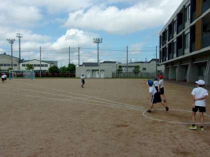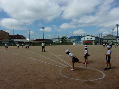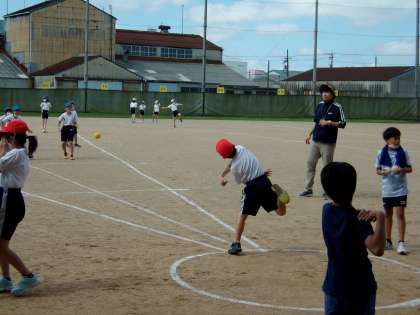 ソフトボール投げを行いました。投げ方に気を付けていました。