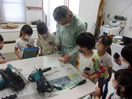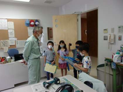 用務員さんとお話しています。用務員室では、電動ドリルを動かして見せてもらったり、たくさんのねじを見せてもらったりしました。