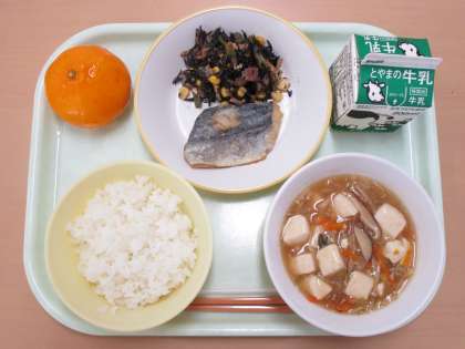 今日の献立は ごはん 牛乳 鰆の西京焼き ひじきのソテー 豆腐の野菜あんかけ 冷凍みかん でした。