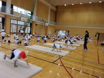 体育の学習で、マット遊びをしました。動物歩きをしたり、体を伸ばして転がったりしました。マットの準備や片付けも、協力してできました。