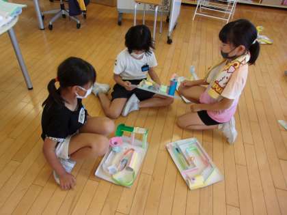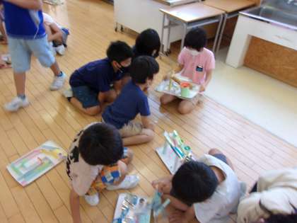 図画工作科で、ビー玉を転がすコースを作りました。出来上がった友達のコースを試しています。