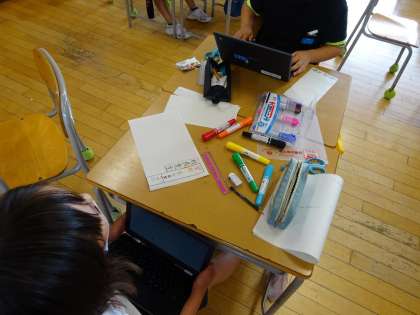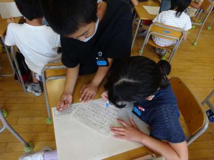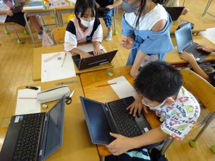 国語科では、アンケートをとったり、インターネットで調べたりしながら、新聞作りに取り組んでいます。