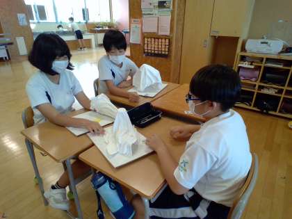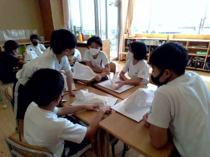 子供たちは、固めた布の形を様々な角度から見て、「何に見えるかな?」と友達と話し合っていました。完成した作品を想像しながら、楽しんで学習しています。