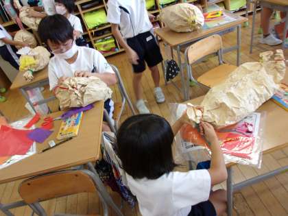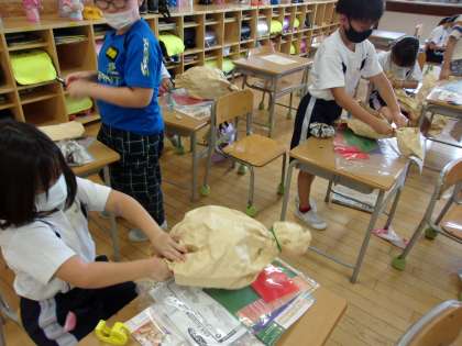 図工科の学習で大きな紙をぎゅうっとぐしゃぐしゃにして、しわしわになった紙からどんなものが生まれるか想像しながら、作品を作りました。中に新聞紙を詰めて、ふっくらさせたり、ねじって細長くしたり、子供たちはそれぞれに作品づくりを楽しみました。