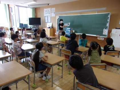 今日は、司書の先生や地域の方に読み聞かせをしていただきました。初めて聞くお話に興味津々の子供たちでした。後半は、図書室へ本を借りに行きました。たくさんの本に親しんでほしいなと思います。