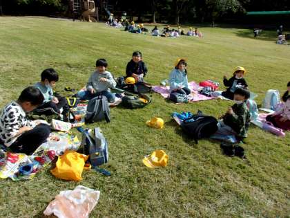 青空の下で食べるお弁当は、とても気持ちよさそうでした。同じ団の友達と楽しくいただきました。