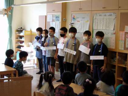 今日は、保育園交流に行ってきました。子供たちは、1回目の時よりも積極的に園児たちに関わっていました。園児に優しく話しかける子供たちの姿が印象的でした。