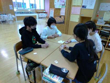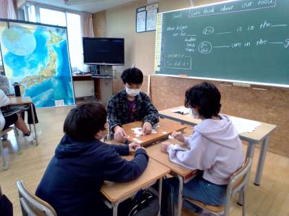 外国語の学習では、自分たちの食生活について考えています。今日は、“〇〇 is in the △△ group.”の表現を使って、めくった食材カードの栄養グループを伝え合いました。