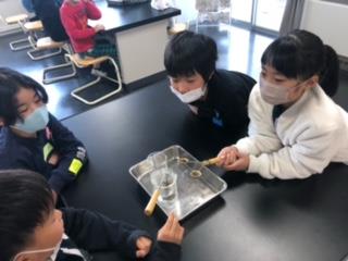 理科では、金属の体積と温度の関係について調べました。