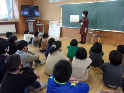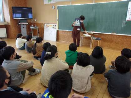 今日は、地域ボランティアの方が読み聞かせをしてくださいました。「いしになったかりゅうど」「くろべのツンコぎつね」の2冊です。普段あまり読まない昔話を興味深く聞いていました。