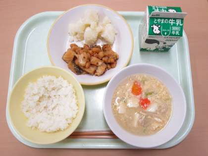 今日の献立は ごはん 牛乳 魚と大豆のねぎソースからめ こふきいも かき玉汁でした。