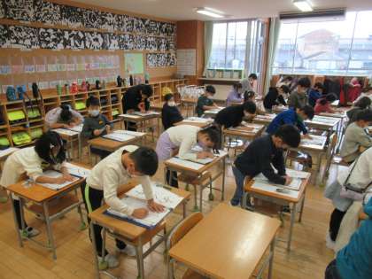 2−2 3学期始業式後の学活、書き初め大会の様子