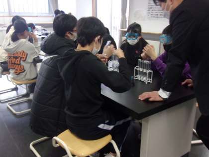 理科では「水溶液の性質を調べよう」の学習をしています。「8本の試験管の中には何種類の液体があるのかな」という課題について各グループで調べています。蒸発させたり、リトマス紙を使ったり、これまでに学習した実験方法から自分たちで選択し、実験を進めています。