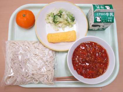 今日の献立は ソフト麺 牛乳 ソフト麺のミートソース 卵ロール グリーンサラダ みかん でした。
