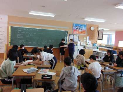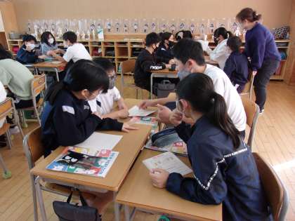 外国語の活動で、小学校の思い出を発表しました。今回はグループで練習をして、みんなの前で発表をしました。発表では、聞く側も反応することを意識して取り組みました。