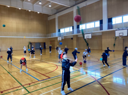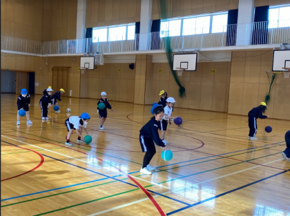 体育の学習でボール遊びをしました。ボールを投げたり、体の周りを回したりして、楽しみながら学習をしています。