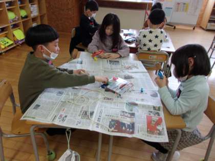子供たちは、こま回しに夢中で、回すコツをつかんで自分で回せるようになってきました。カラーペンで、思い思いに色を塗り、オリジナルのこまに仕上げています。