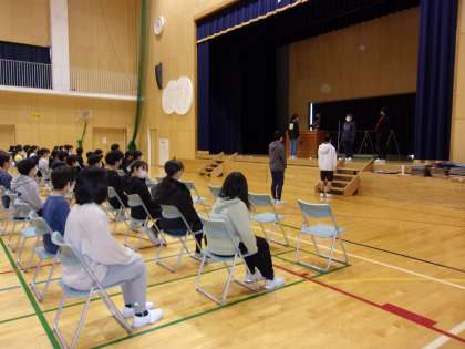 4時間目には、体育館で卒業証書授与の動きの確認や、座り方、立ち方の練習を行いました。緊張感をもって、1回1回の練習を取り組んでいきます。