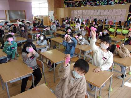 生活科の学習で、来年度の新入生を招待する準備をしています。登下校や給食等、学校生活のことや、音読や計算等、学習のことを紹介するために、グループに分かれて練習をしています。お土産に折り紙もつくりました。来年度の新入生に楽しんでもらおうと、熱心に取り組んでいます。