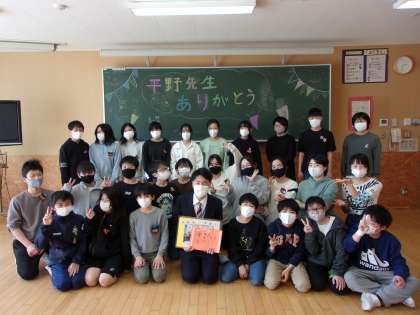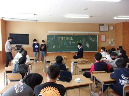 9月からお世話になった平野先生とも今日でお別れです。子供たちからサプライズで、平野先生に集会が開かれました。集会では、お別れの言葉やお笑い、スライド、プレゼント等出し物がありました。また、平野先生と一緒にピラミットじゃんけんをしました。良い思い出を作ることができました。