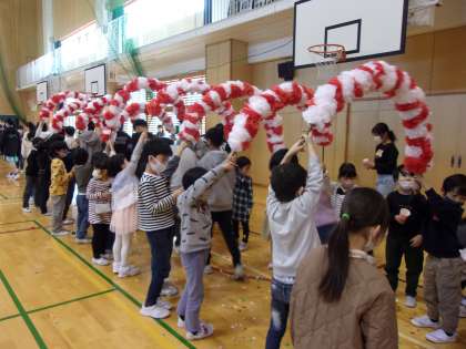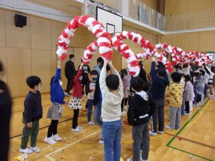 今日は6年生の卒業を祝う会があり、1年生は入場のアーチを持つ係と、紙コップクラッカーを鳴らす係と、花道で出迎える係に分かれてお祝いをしました。6年生が通りやすいようにアーチを高く上げたり、知っている6年生が通るときに手を振ったりしながら、楽しそうに参加していました。
