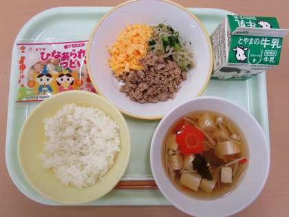 今日の献立は、ごはん 牛乳 そぼろ丼(豚そぼろ・炒り卵)なばなひたし すまし汁 ひなあられ でした。