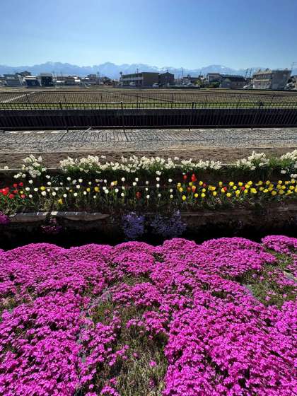 手前から、シバザクラ、チューリップ、スイセン、そして少し間はあきますが立山連峰です。