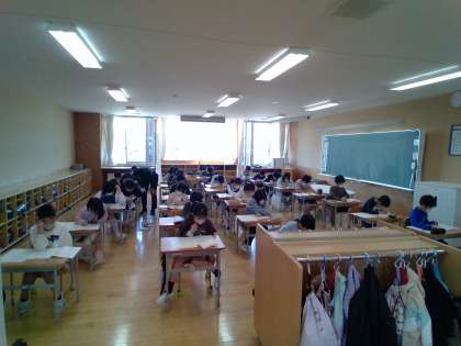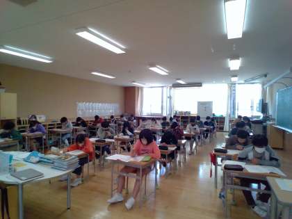 今日は学力調査2日目です。算数と社会に取り組んでいます。時間いっぱい集中して取り組んでいます。