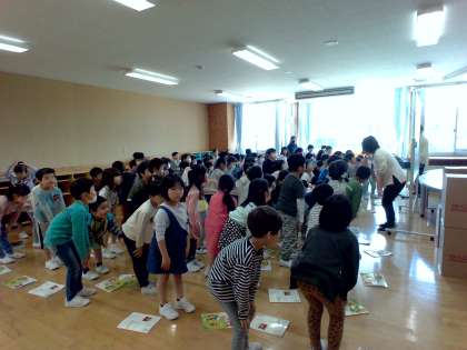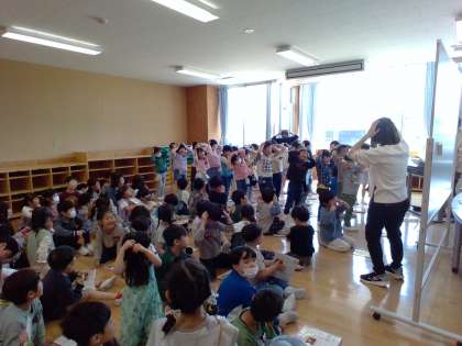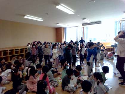 今日は音楽の学習で「チェッ チェッ コリ」を歌いました。また、歌に合わせて体を動かし、楽しく踊りました。