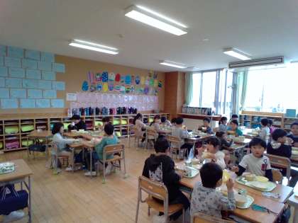 今日から、子供たちは机をグループの形にして、給食を食べました。ゴールデンウィークの楽しかった思い出を話していました。