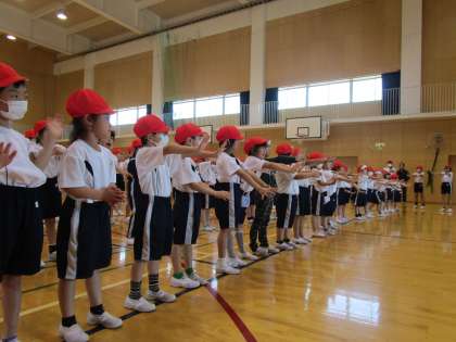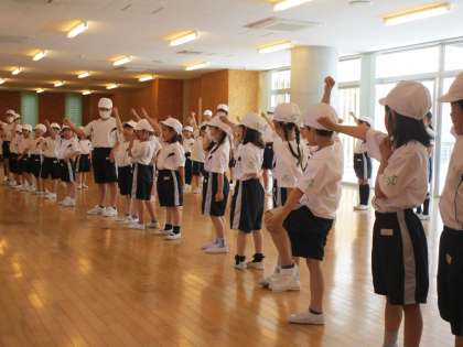 応援合戦の練習をしました。6年生さんの話を聞きながら、動きやかけ声を覚えられるように一生懸命練習しました。赤団と白団の様子です。