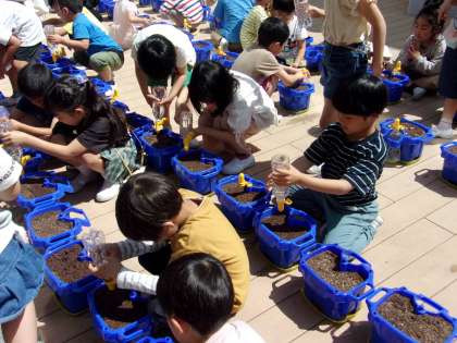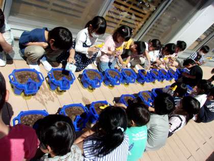 生活の学習で、あさがおを育てていきます。今日は、まず種をじっくりと観察しました。色や形、大きさ、触った感じなどいろいろな特徴を見付けることができました。その後、土に種を植え、水をやりました。「元気に咲いてね」「きれいになってね」とあさがおに話しかけながら、心をこめて水をやることができました。