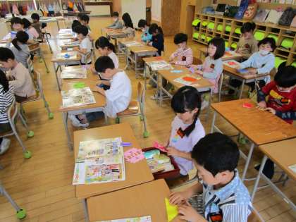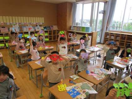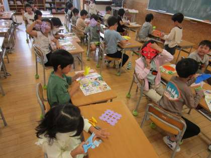 図画工作科では、折り紙を折って、切って、かざりを作っています。切り取った形もすてきな形になり、かざりをつなげるのが楽しみです。