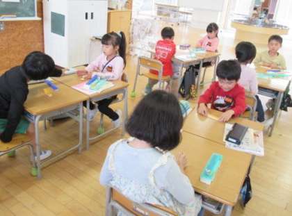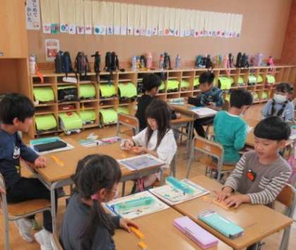 算数では、「いくつといくつ」の学習をしています。6〜10の数がいくつといくつに分けられるか、ブロックを使って問題を出し合いながら楽しく学習しています。何度も問題を出し合い答えるうちに、どんどん早く答えられるようになっています。