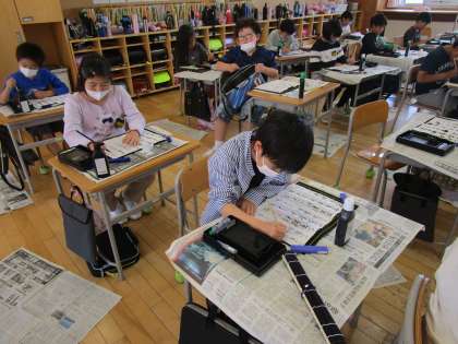 3年生になって初めて筆を使って書く子供も多い書写の時間です。今回は細筆を使って名前を書く練習をしました。お手本をよく見て、真剣に書いていました。