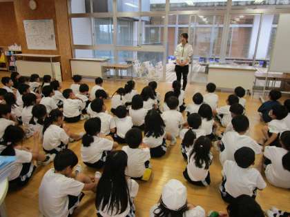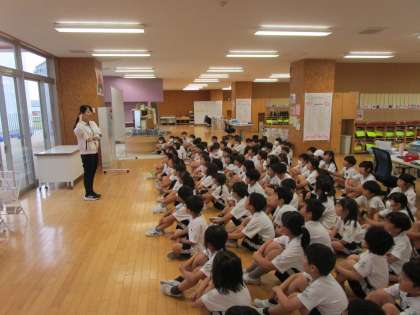 1年生全員が集まって、学年朝の会をしています。みんな真剣に先生の話を聞いています。