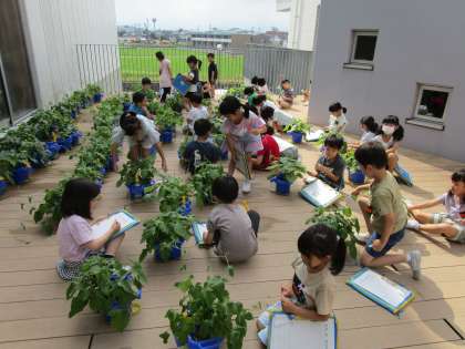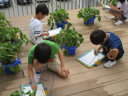 アサガオの観察をしました。葉が大きくなり、ツルもも伸びてきました。