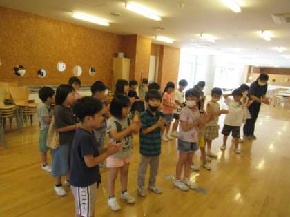 音楽の時間に、はくにのって「たん・たん・たん・うん」のリズムをうちました。3文字の言葉に合わせて、みんなで楽しみながら手拍子をしました。