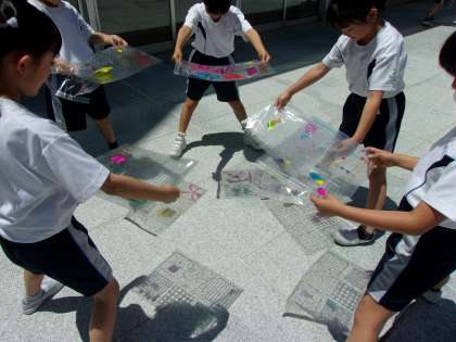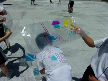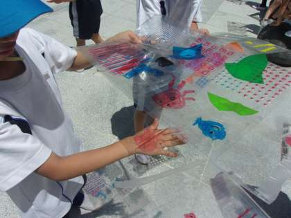 透明プラスチックの でこぼこシートに光を通すと、影に模様がつきました。カラーセロハンの色も映り、とてもきれいです。体や服に影で模様がつくことを楽しんでいました。