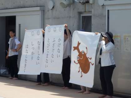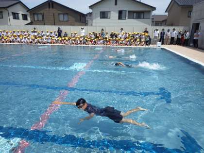3限にプール開きがありました。みんなが安全に過ごせるように、プールの使い方の確認をしました。5,6年生の代表児童がクロール、平泳ぎ、バラフライを披露してくれました。