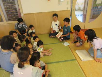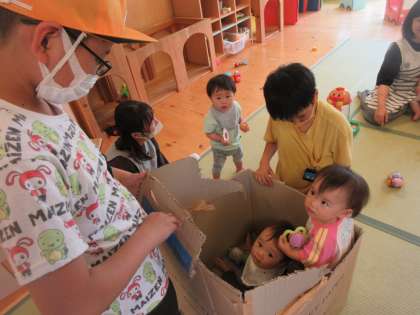0歳では、自分たちで作った段ボールの乗り物に子供たちを乗せて遊んでいました。1歳児は読み聞かせやブロック遊び、2歳児ではだるまさんが転んだなどの活動で楽しみました。
