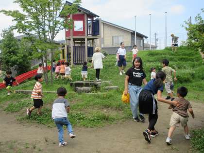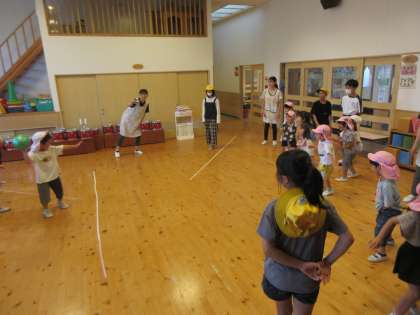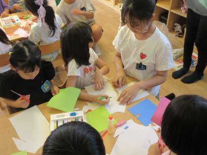 年小グループは外で鬼ごっこ、年中グループはドッジボール、年長グループは手作りの紙Tシャツ作りなどをして交流を楽しみました。5年生が子供たちの前に立ち、活動の説明をしている姿は、未来の6年生のような姿でした。交流会を通して、最高学年に向けてまた一歩成長した5年生でした。