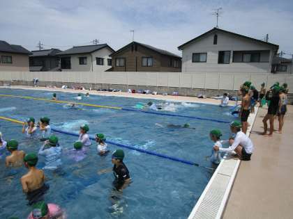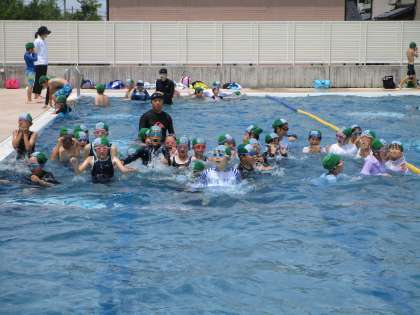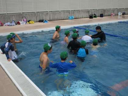 今日は気温も高く、子供たちは朝から水泳学習の時間を楽しみにしていました。自分のレベルに合ったグループで練習しています。水泳学習の後に、今日初めてできるようになったことやがんばったことを話す子供たちは、とてもうれしそうでした。