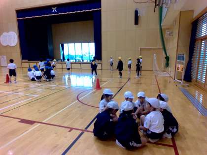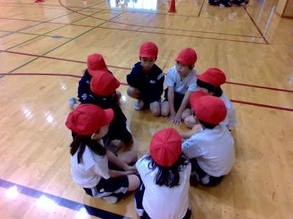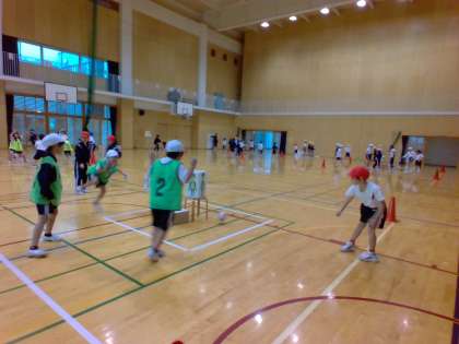 体育科の学習では、的当てゲームを行っています。子供たちは、たくさんクラッシュするための動きや作戦を考えてゲームを楽しんでいます。