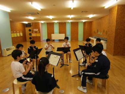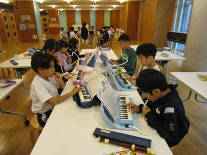 音楽の学習では「パフ」をしています。ひびき合いを感じながら演奏しようをテーマにリコーダー、鍵盤ハーモニカ、鉄琴、低音、打楽器(タンバリンやカスタネット)に分かれて練習しています。みんなと音を合わせると、とても楽しいと感じている様子です。