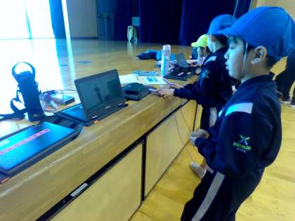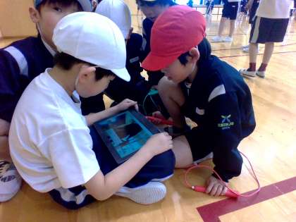 体育科の学習では、短なわとびの学習を行っています。子供たちは、動画を観て、跳び方を学んだり、友達と動きを撮影し合ったりしながら、できる技を増やしています。