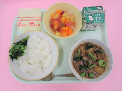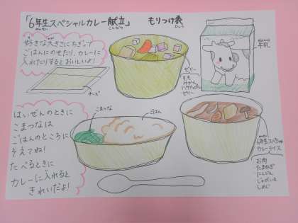 今日の給食は6年生スペシャルカレー献立でした。6年生が外国語の授業に考案しました。普段のカレーとは違い、しめじ、小松菜、スライスチーズが入っているのが特徴です。子供たちは小松菜をカレーに混ぜたり、チーズをちぎって入れたりと、各々で楽しみながら給食を味わっていました。