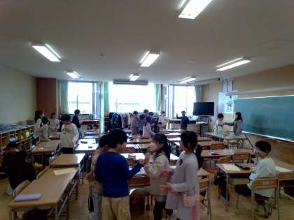 飾り係が折り紙でつくった作品やイラストを景品にして、じゃんけん大会が開かれました。みんなに景品を渡せるように、参加賞もつくっていました。
