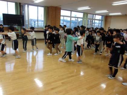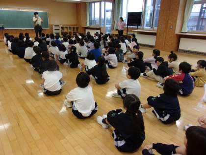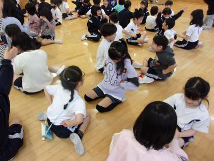 今日は2年生になって初めての音楽の授業がありました。学年みんなで貨物列車をしたりおちゃらかほいをしたりして、仲良く交流しました。その後は2年生の教科書に載っている歌をみんなで聴いたり、元気よく歌ったりしました。