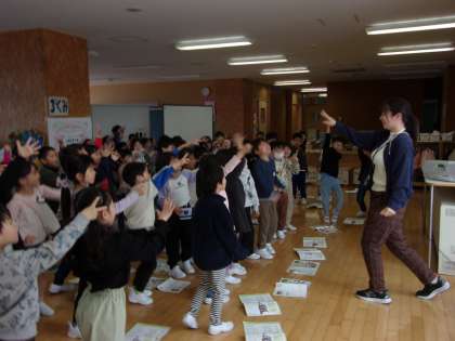 学年全体で初めての音楽を行いました。音楽に合わせて体を動かしたり、じゃんけんをしたりして楽しみました。